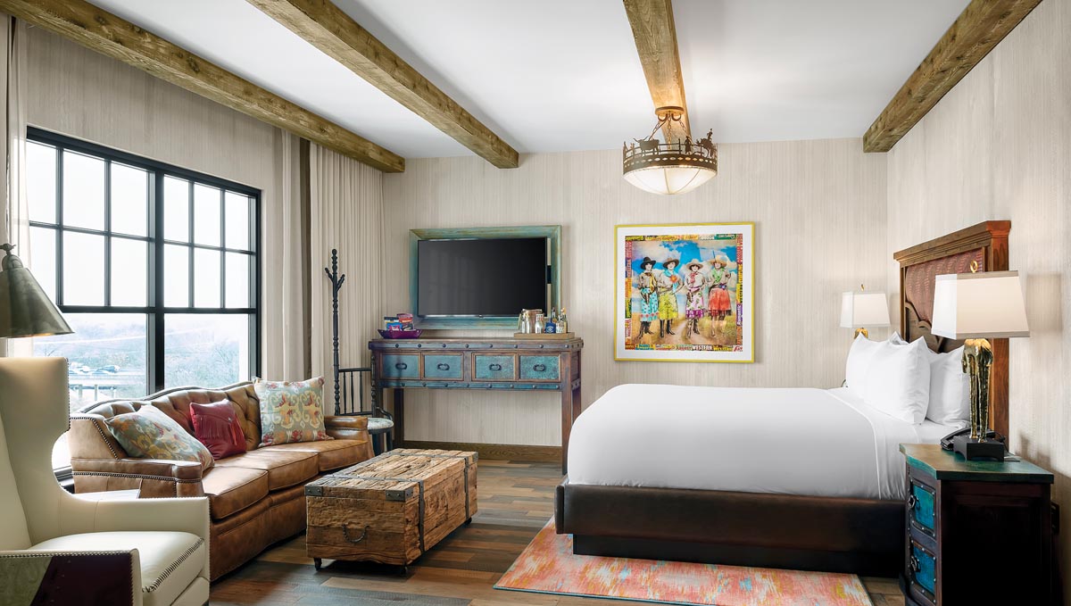 Inside, the spacious two-story lobby includes lots of leather sofas, a library filled with Texas-themed books and a bar with comfy lounge seating. And while there are plenty of shopping options in the Stockyards, you’ll find two inside the hotel. The Lucchese Custom Collection offers accessories, plus custom and made-to-fit boots exclusive to this store. Little White Lies is a boutique featuring apparel, gifts, jewelry and more, all in pale colors befitting the name.