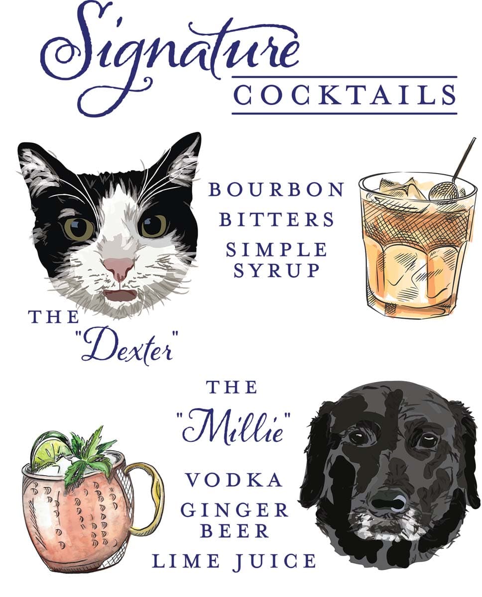 Paper Planet If your pet had a favorite cocktail, what would it be? One creative couple gave a nod to their cat and dog at their wedding reception by commissioning Paper Planet to create a signature cocktails sign with the animals’ likenesses. The resulting sign invited guests to enjoy the “Dexter” (bourbon, bitters and simple syrup) or the “Millie” (vodka, ginger beer and lime), in honor of their four-legged family members. Paper Planet owner Julie West says staff artists hand-draw the likenesses from photos — they like to have at least two photos to work from so they can capture the subject’s personality — before turning them into digital artwork for use on signs, save-the-dates, custom maps, coasters, cocktail napkins and more. 6515 E. Lancaster Ave., Fort Worth, 817-451-8898, paperplanetdesign.com.