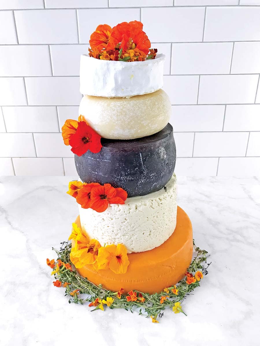 Cheese Lover Artisan Wedding Cake If your ideal wedding cake isn’t cake at all, consider Costco’s new Sid Wainer & Son Cheese Lover Artisan Wedding Cake, which fits the tiered profile but indulges tastes that lean more savory than sweet. The “cake” totals 24 pounds of cheeses, sourced from around the world, and serves 105 to 150 people. Shipped in a flat crate, the kit includes an 8-pound wheel of Red Leicester; 7 pounds of Danish Blue; 5 pounds of Murcia al Vino, a drunken goat cheese; 3 pounds of Tuscan Sheep’s Cheese; and 17 ounces of White Angelique Triple Cream Brie. All that’s left to do is to unwrap each wheel of cheese, stack them from largest to smallest and garnish with edible flowers or fresh herbs. $439.99 including shipping from costco.com.