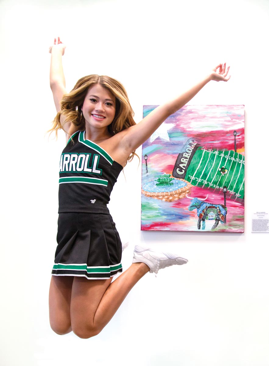 This year, Hanson also meshed her artistic abilities with her love of cheer by helping design new uniforms for the team’s 2020-21 season. She also branched out by entering an art contest through the PNC Bank in Southlake’s Town Square, choosing to use acrylics rather than ink. Her submission, which portrayed a mix of different Southlake landmarks set against the Texas flag, was one of five chosen to be displayed in the bank.