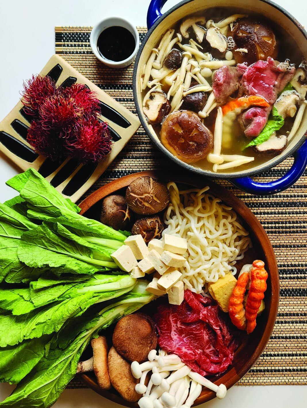The hot pot varies from country to country, but the communal dish is quick and easy to make. Thinly sliced meats, seafood, vegetables and noodles are poached in a broth. The flavors might differ, but it’s all about gathering and sharing. Photo by Meda Kessler