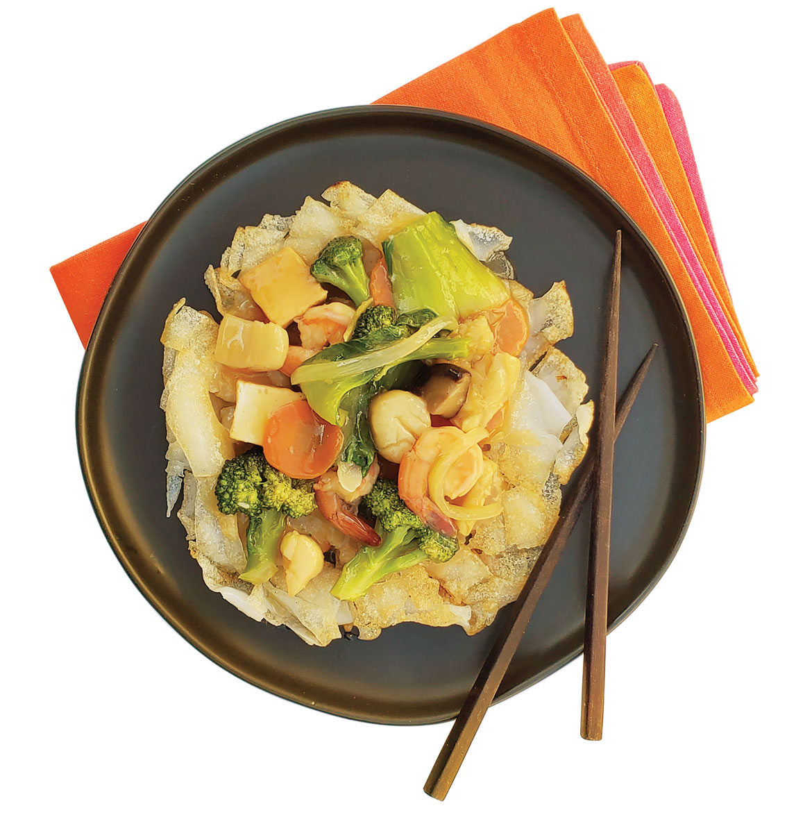 Stir-fried seafood and vegetables over crispy flat noodles from My Lan Vietnamese Kitchen