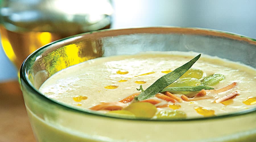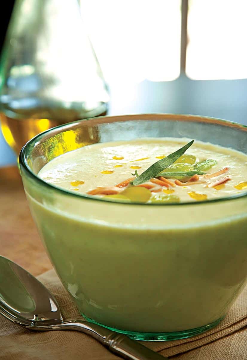 This creamy white gazpacho is as refreshing as its tomato-based cousin but makes a more elegant presentation. It’s light yet substantial, and the garnish adds a bit of the chunkiness found in a more traditional gazpacho.