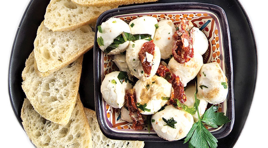 Our Mediterranean/Italian spread includes sun-dried tomatoes; marinated mozzarella with sun-dried tomatoes and basil and baguette slices; hearty meatballs; and tortellini with pesto, peas and prosciutto.