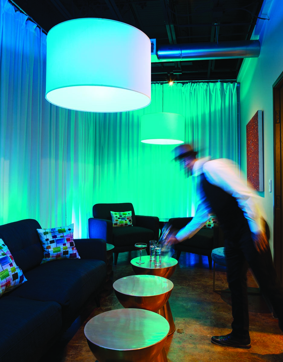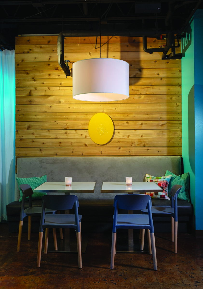 With limited space, the lounge had to be free of clutter. There’s bar seating plus a few cocktail tables; banquette seating anchors one end of the lounge. Upholstered chairs offer cozy seating in front of the gas fireplace. There’s also the Rainbow Room, named for its colorful lighting.