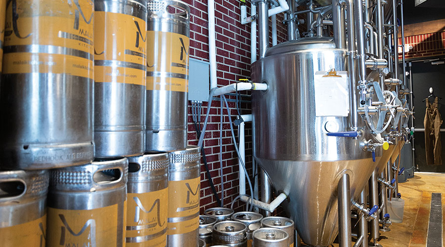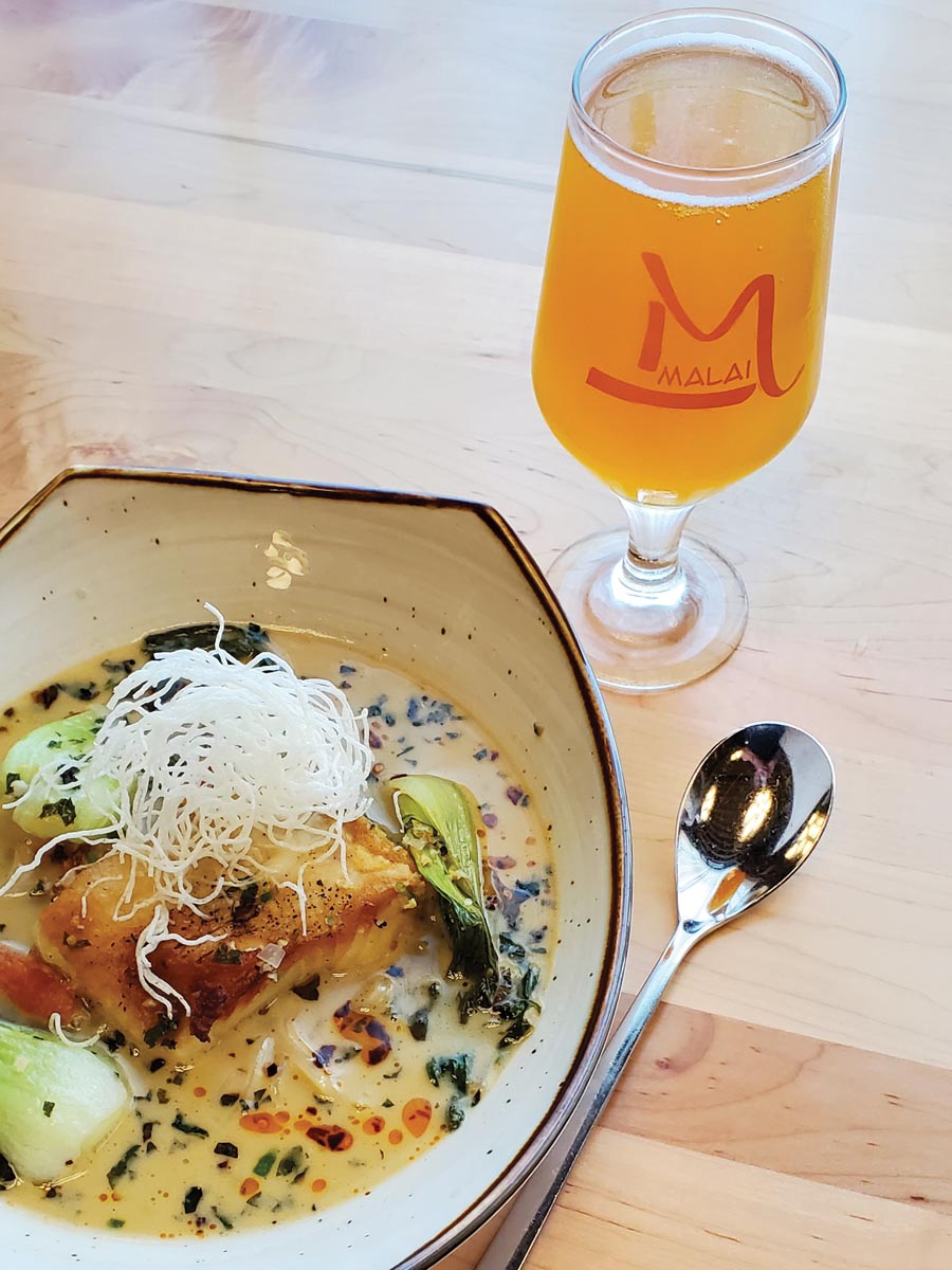 The restaurant-brewpub is a new experience for Meyers, who works with chef-owner Braden Wages in coming up with the small-batch brews for Malai. Wages is as passionate about his beverage program as he is about his modern Thai and Vietnamese menu. Inspired by beers sampled on trips to Southeast Asia, Wages and his wife and business partner, Yasmin, acquired a brewpub license for their restaurants. Ingredients such as rice, lemongrass, fresh coconut juice (extracted in-house) and kaffir lime make them distinctive and highly compatible with the food. (Look for a New England Hazy IPA on the menu soon.)