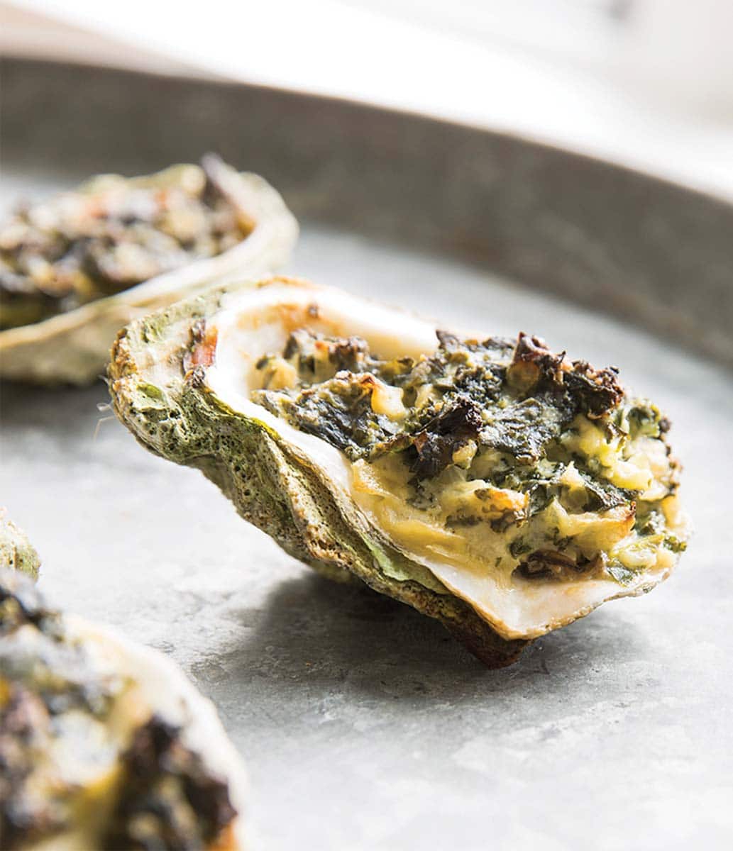 Place tablespoon of mixture atop each raw oyster; arrange on baking sheet and bake until topping is bubbly, about 5 minutes or so. Serve hot.