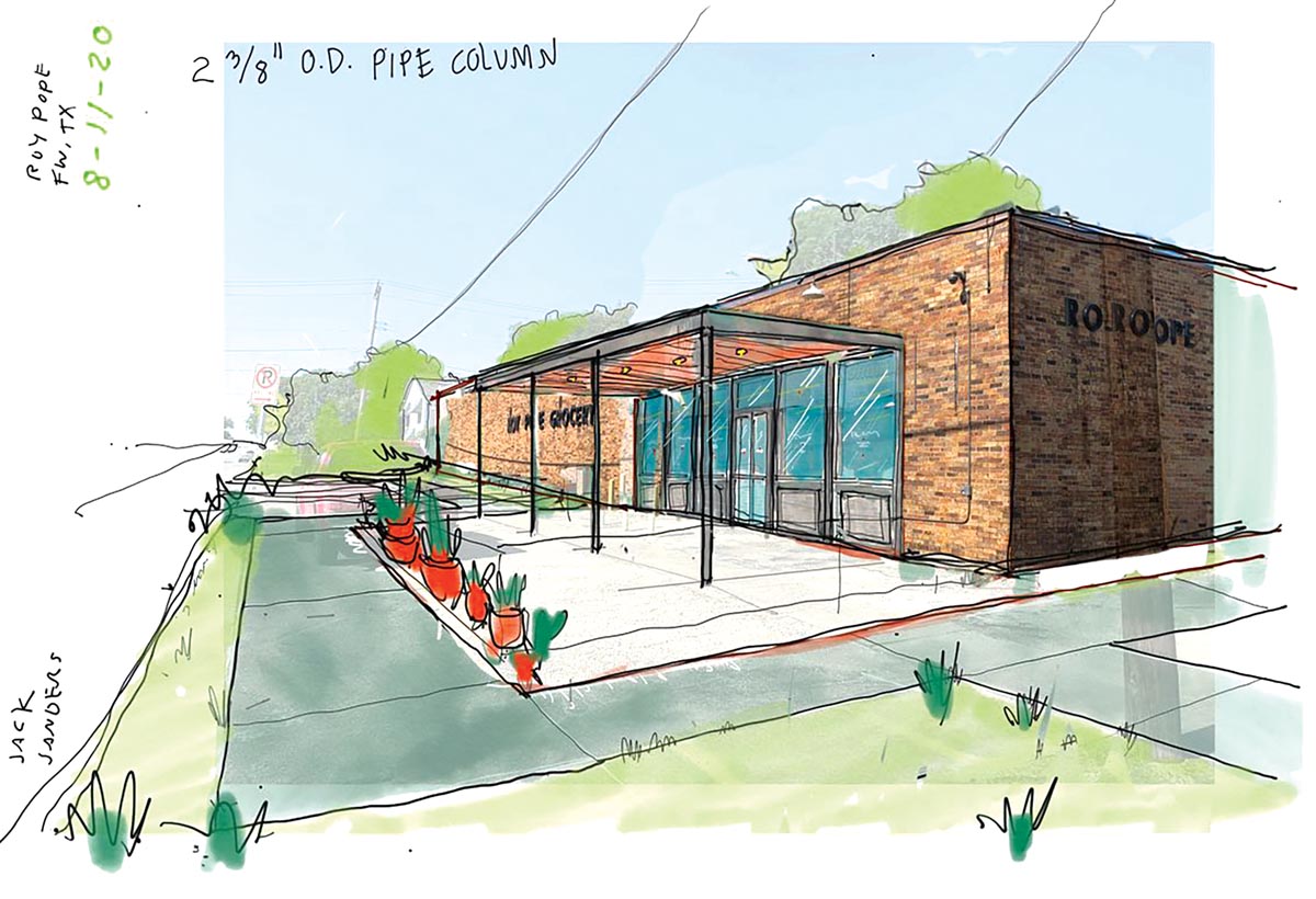 Construction and remodeling are now in full swing at the landmark grocer in Fort Worth’s Westside. The renderings for the new design by Jack Sanders of Austin give us a small glimpse at what’s to come. Sanders, an architectural designer, is a Fort Worth native whose parents are Roy Pope customers. Sanders is a graduate of Auburn University’s Rural Studio, an innovative design-build architecture program that has its students complete a project that benefits low-income communities. One thing that has been completed on the project is a new custom-built 500-gallon offset smoker from Mill Scale Metal Works in Lockhart, the go-to craftsmen for many pitmasters in Texas.