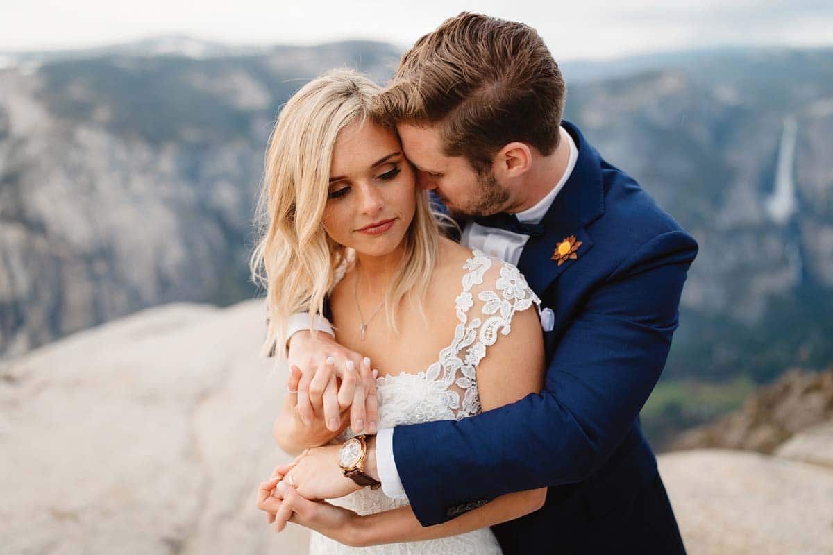 Just as the setting wasn’t traditional, the wedding wouldn’t be at a customary hour, either, but instead at sunrise — 5:30 a.m. Considering the hourlong drive to Glacier Point from the cabin, Morgan woke up at 3:15 a.m. to slip into the cap-sleeve lace overlay gown by Watters that she’d bought back home in Texas, paired with a fingertip-length veil. She relied on friends and family for help with her makeup and hair, which they swept into an elegant chignon. The bride, together with her cousin Anna, arranged the bouquet ahead of time, with white roses, hydrangea and baby’s breath from Trader Joe’s.