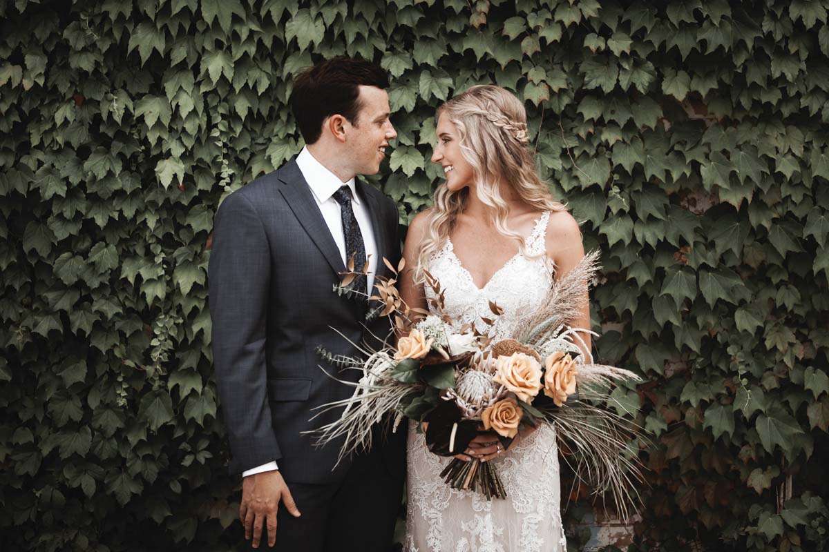 Under a suspended installation of exotic peach, blush and beige blooms including anthurium and Quicksand roses, and before more than 200 guests, Paige and Mason became husband and wife.