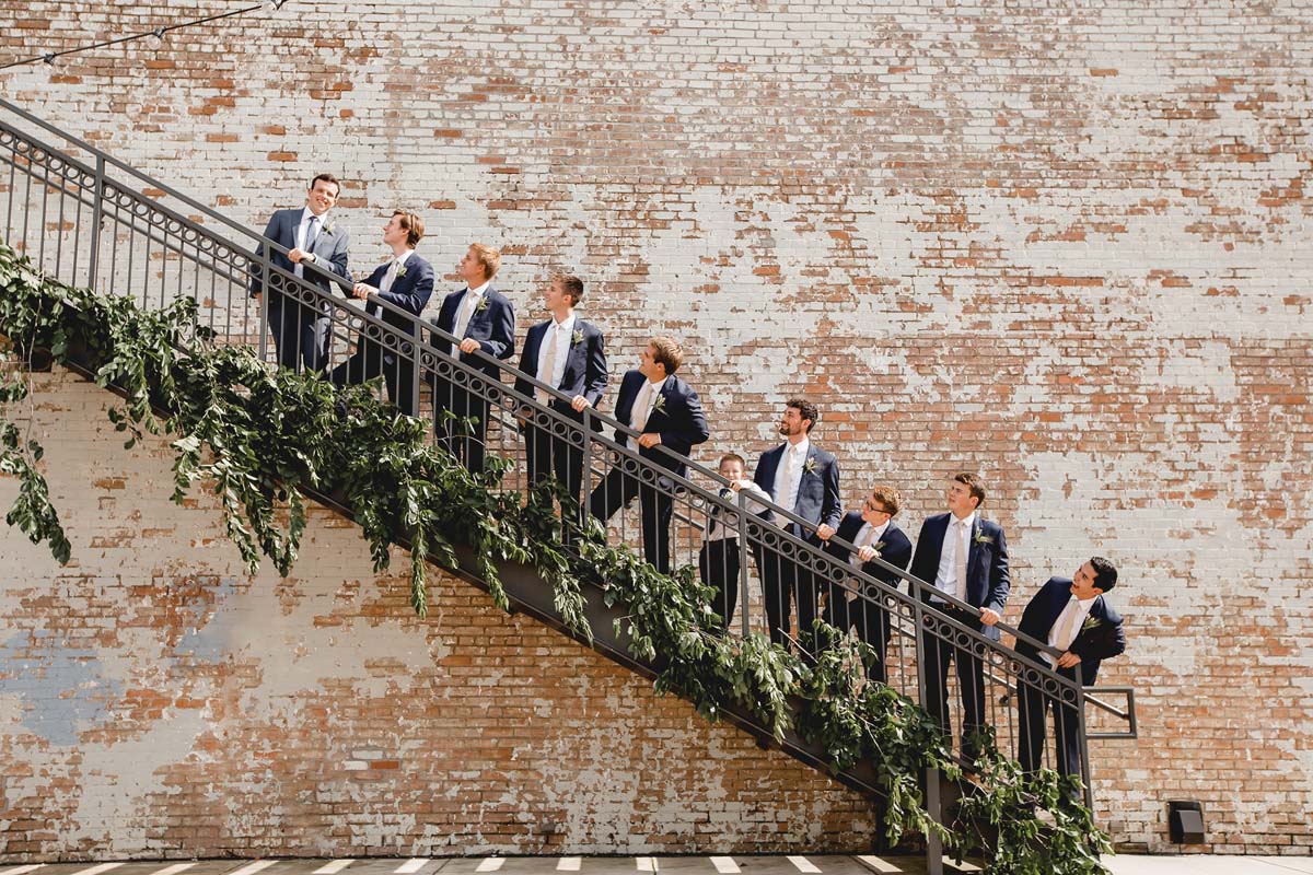 With only eight months to plan a wedding, neither Paige nor Mason blinked. Not to say the hunt for the ideal wedding gown was not without its twists and turns, but it proved fortuitous. While Paige and her mother searched for the perfect dress, the bride met her wedding planner by chance. “I was looking at a pop-up store, and that’s where I met Deryk [Poynor] and Jordan [Cook] who were there with The Greenhouse 817,” Paige says. “They asked, ‘Are you looking for a wedding planner?’ and we said yes.” Paige was smitten with the floral designs from the South Main Street store, too, so she signed the duo on to beautify her “blank-slate” venue at Brik. (And, not to worry, a beautiful dress was at last found at the now-defunct De Ma Fille.)