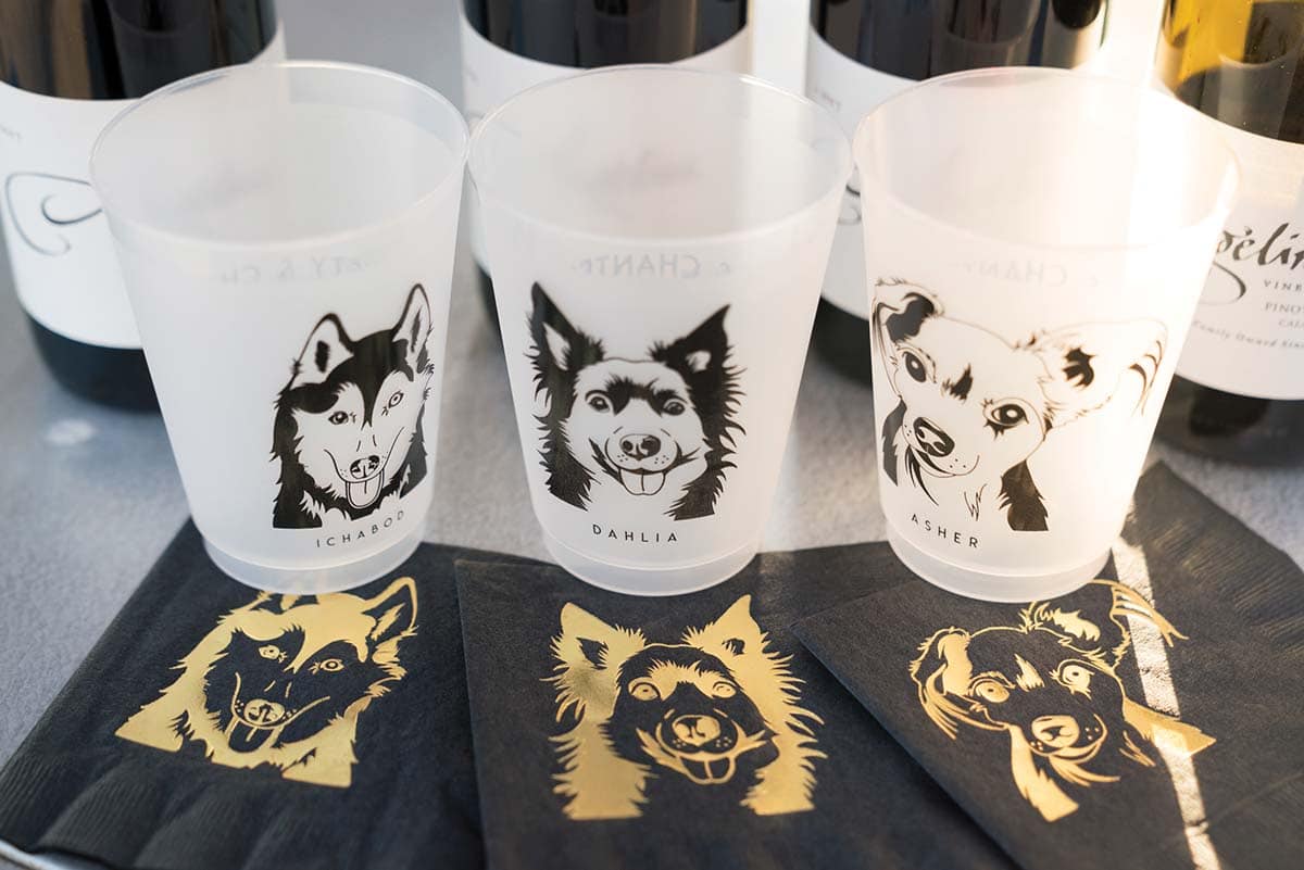 Dahlia, Ichabod and Asher shared in the love by participating in the ceremony. Each dog wore a custom collar — the male dogs sported bow ties from an Etsy artisan in England, while Dahlia’s floral version was made by All That Glam — and walked down the aisle with an accompanying bridesmaid and groomsman.
