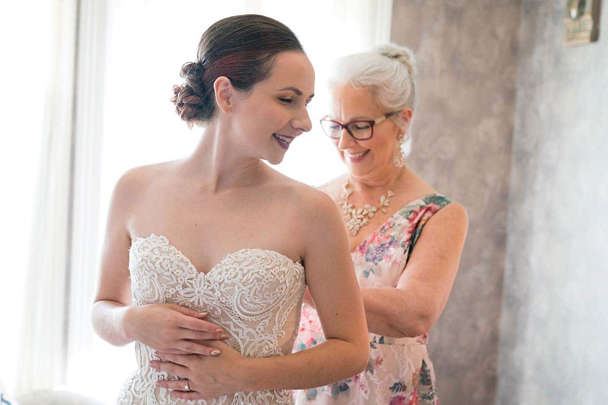 Leah found the dress-shopping experience overwhelming and chose a dress the first busy day of looking, with her mom and future mother-in-law along. But at alteration time, Leah realized it wasn’t the dress for her at all, and her especially understanding mom helped ease the bride-to-be through looking at still more shops. Suddenly, the right dress appeared at Wed Bridal Boutique, which had just opened, and Leah surprised herself by finding joy in a strapless lace gown after initially thinking that wasn’t her style.