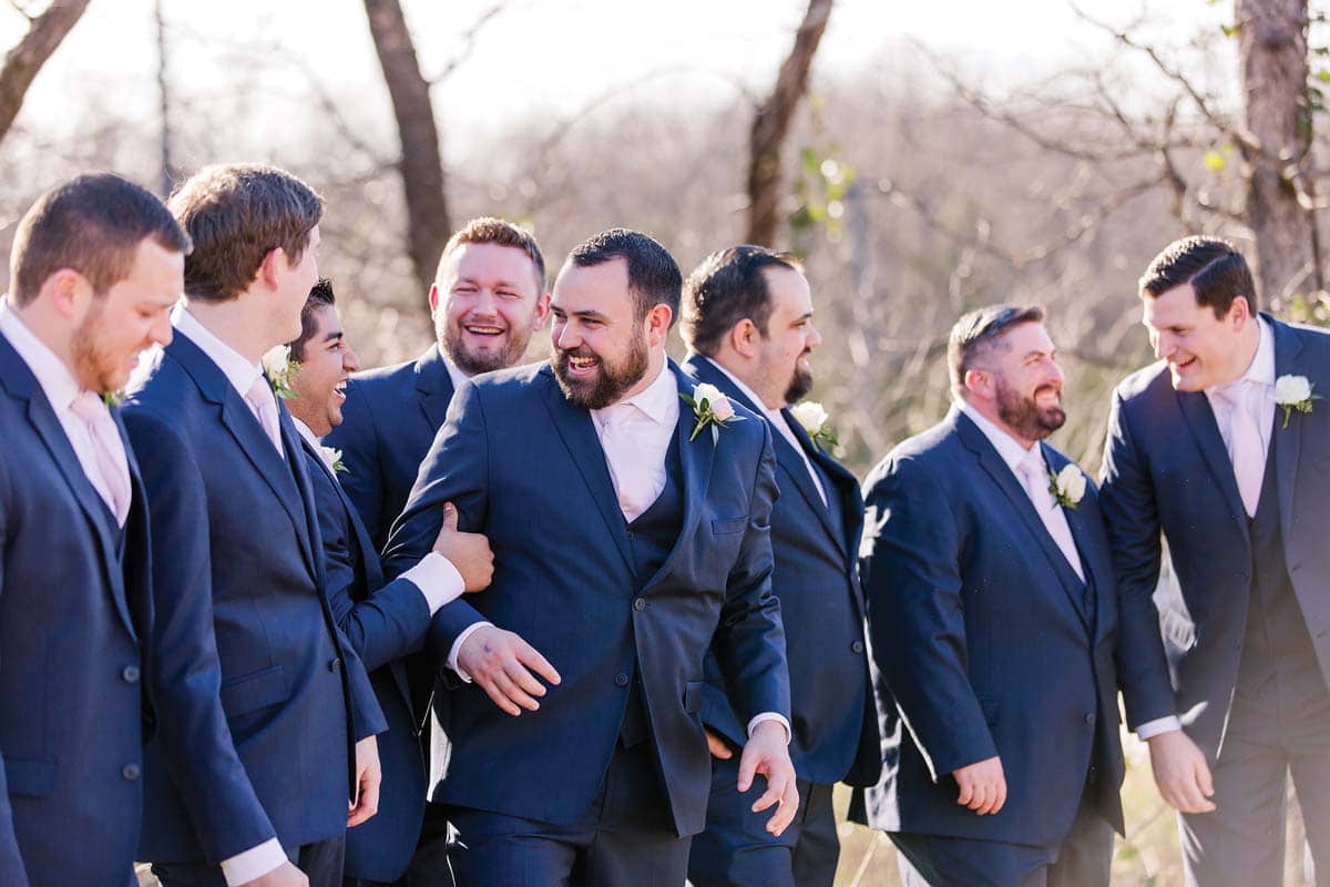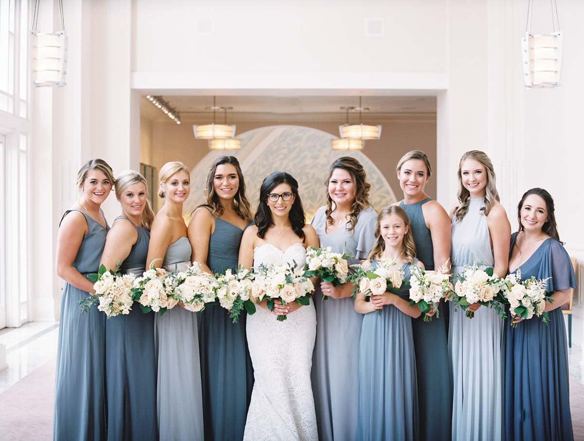 The couple had 16 close family members and friends in their wedding party. The ladies donned blush pink chiffon dresses, while the groom and groomsmen wore navy suits with white shirts and blush pink ties. Jennifer says the striped Hayley Paige dress she wore was not what she would have pictured herself wearing, but when she tried it on, she immediately knew it was the one. “It was the most fun dress I have ever put on. I didn’t want to take it off,” she says. “I felt incredible in it — like my best self. I felt every way a bride wants to feel on her wedding day.”