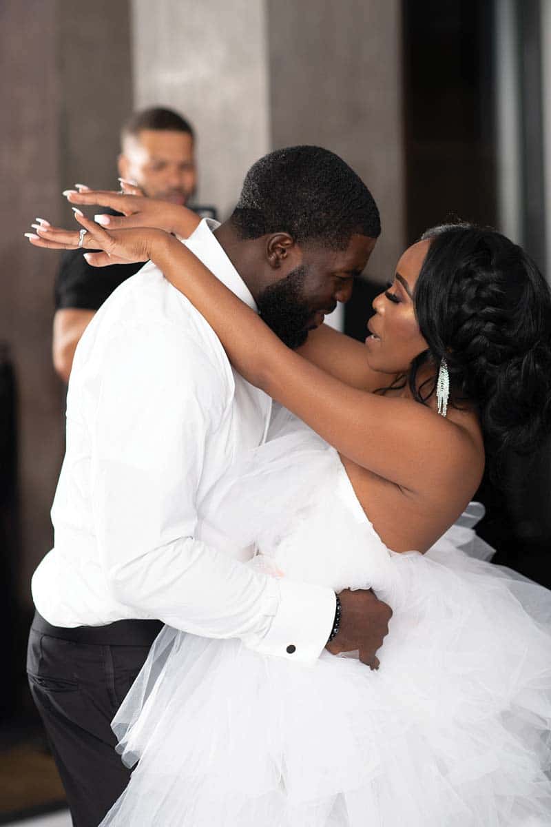 For the ceremony, the bride chose a form-fitting lace gown by Martina Liana from Bridal Boutique in Lewisville. Bridesmaids wore their own choice of black dress. For the reception, she chose a custom dramatic layered tulle gown by Oyemwen. “I had found the designer on Instagram,” Breonna says. “I wanted something whimsical, free flowing and effortless, easy to dance in.”