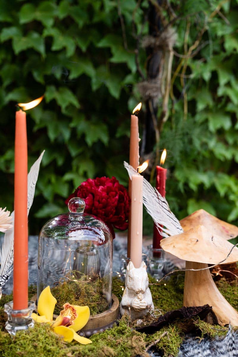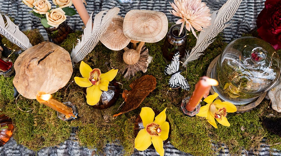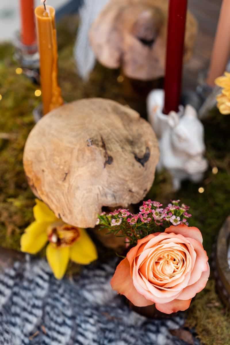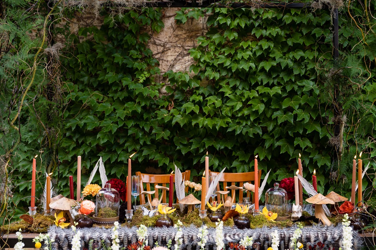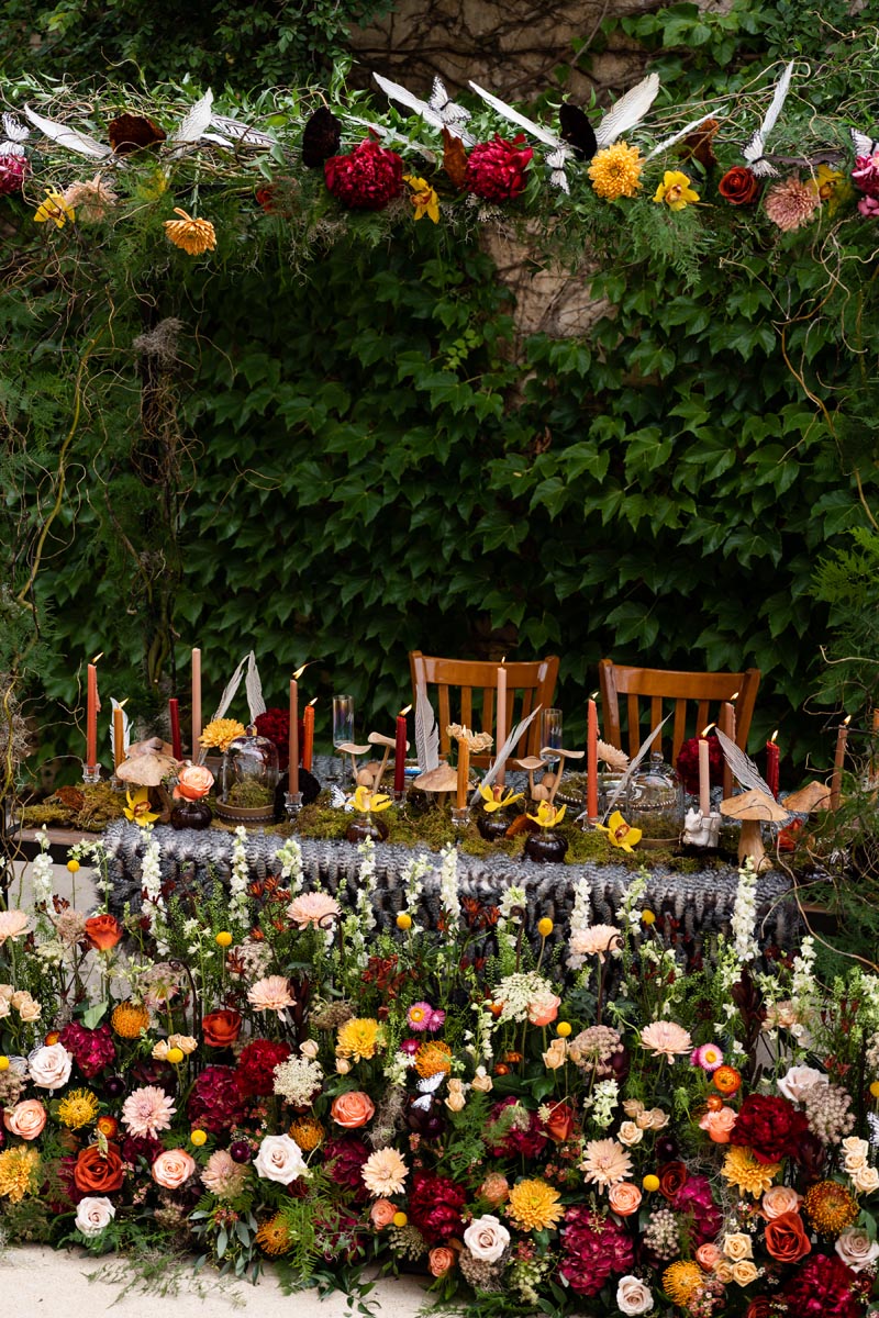 “We really wanted this table to feel like it was set in an enchanted forest. We wanted it to be dramatic, but still have special surprises hidden among the table design. Beautifully hand-carved mushrooms and autumn florals were our inspiration. This display has many details from fairy glass place settings to woodland creatures. Our favorite details though are the black and white feathers and butterflies that bring a touch of modern to our classic fairytale table.”
