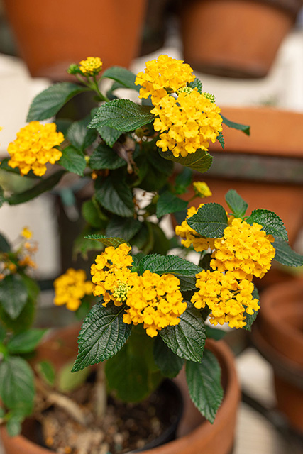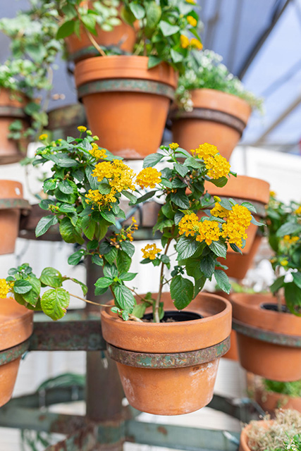 The finishing touch for a show-stopping potted plant is a “spiller,” or a plant that cascades over the edge of the container. A classic choice for this is ivy, which will grow in almost any conditions. Another low-maintenance, high-impact option is lantana. Lantana comes in several colors and is a hardy perennial shrub, meaning it goes dormant when cold and returns in the spring.