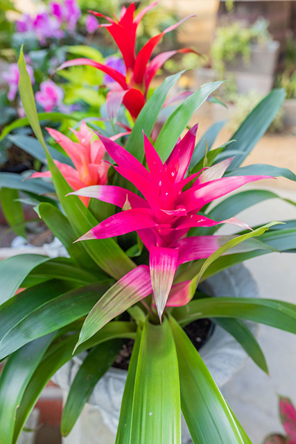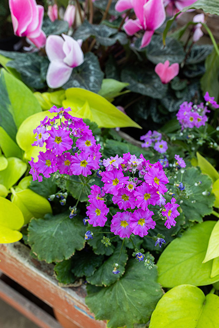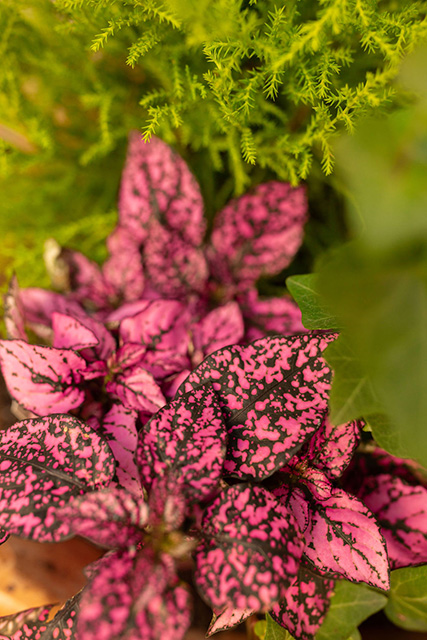 Next, a “filler,” or a medium-sized plant provides fullness in the container. Stephanie chose pink splash for a pop of color. Button ferns are also a great choice to take up space.