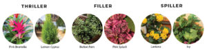 The “thriller” plant is a tall, eye-catching plant to add height. Stephanie suggests the lemon cyprus as they tend to thrive in the Fort Worth climate. Plus, their bright chartreuse coloring makes them a focal point in a container.