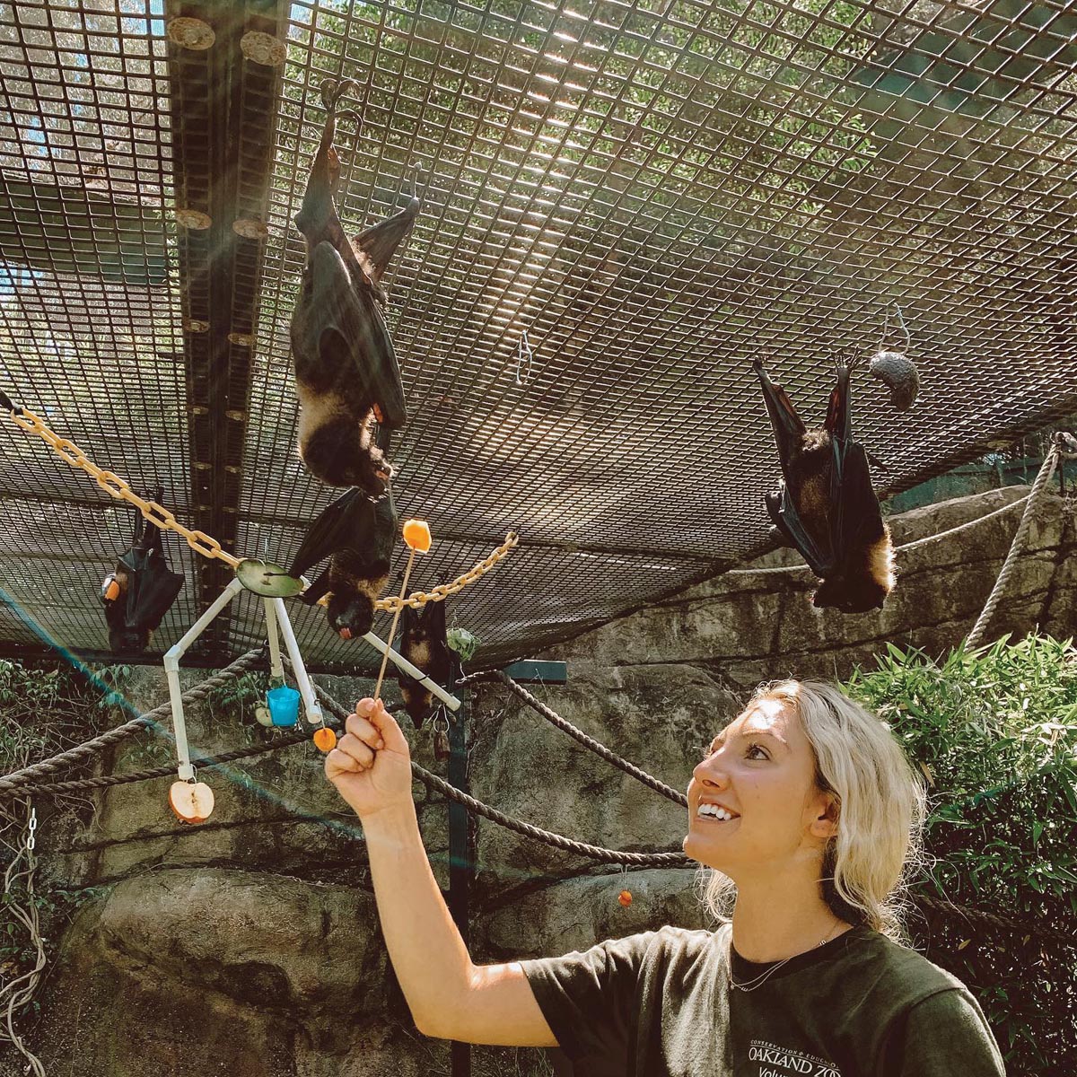 In addition to school, she took a job as an unpaid volunteer at the Oakland Zoo. “I worked with otters and bats. I was more nervous about the bats, but discovered that they are the biggest love bugs. They were attracted to the smell of my hair along with fruit.”