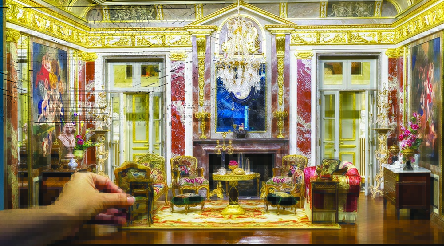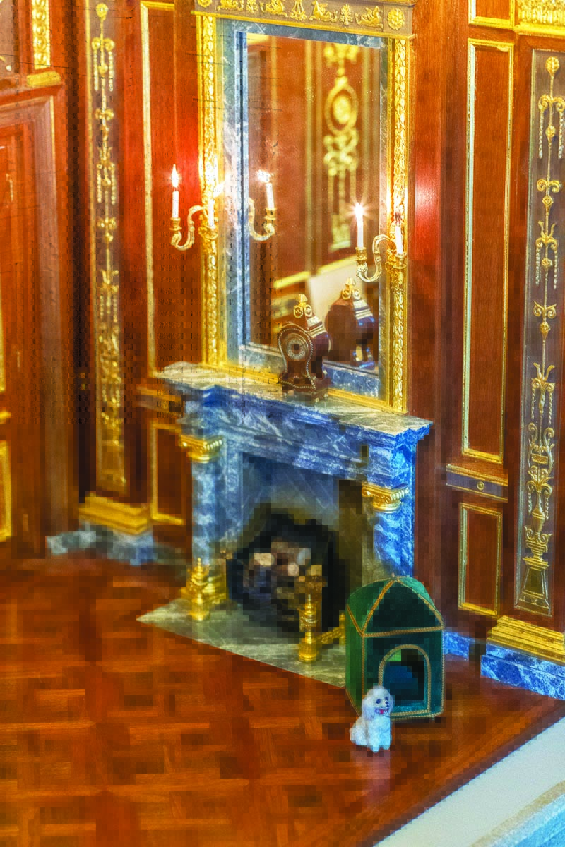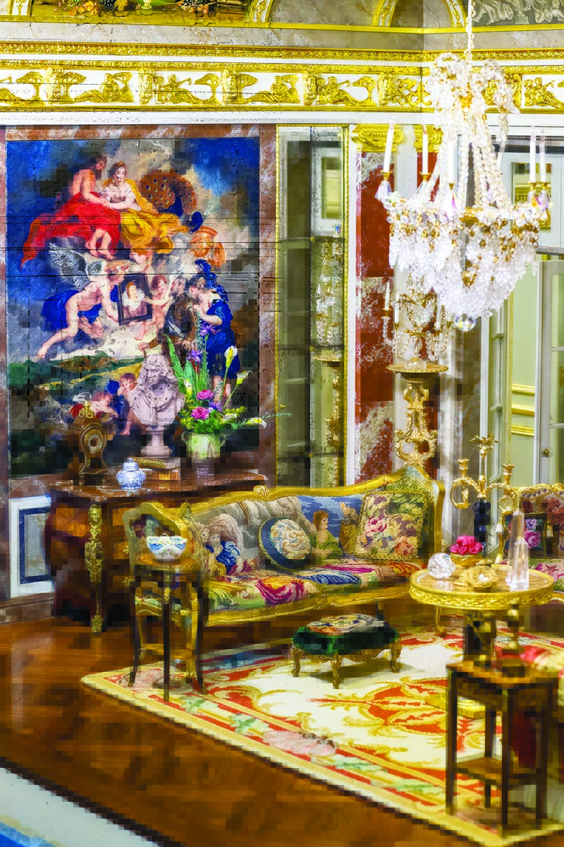 As she “walks” a visitor through her magnum opus, she opens hinged panels in a delightful, slow reveal of each room. Furnishing is still in progress, but she reels off the names of the creators of pieces already placed, including rare marquetry by Denis Hillman. “Two of his pieces sold at auction for $22,000,” she says. “But some of his works were somehow overlooked in an auction lot that I discovered. I had to buy the whole lot to get his French pieces, but it was a steal and quite the scoop.” Hand-painted wall panels are exact copies of works by Rubens.