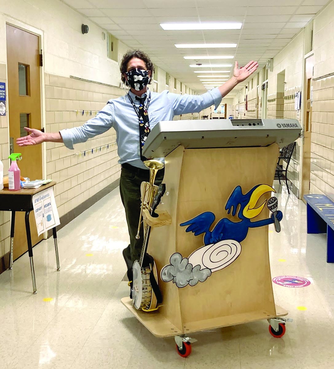 Not all students stayed home, but things were different at the school, too. For Jan, singing through a mask his broad, infectious smile. And because kids didn’t change classes, his music classroom was replaced by a rolling cart for his instruments. “I had to wheel quickly between classrooms all day long,” he says. The custom design, crafted by a friend, held Jan’s keyboard, his banjo and a trumpet, among other items, and was personalized by a singing carved-wood Roadrunner (the school mascot) gifted to him by Donna. He was determined to make it work. “Music is all about communication, community, expression. It is absolutely essential to human existence.”