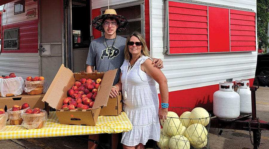 A small red-and-white camper trailer holds some of the supplies, and Shannon also drives a vintage red pickup, both suited to this roadside entrepreneur who, along with Finn, started selling peaches almost 10 years ago.