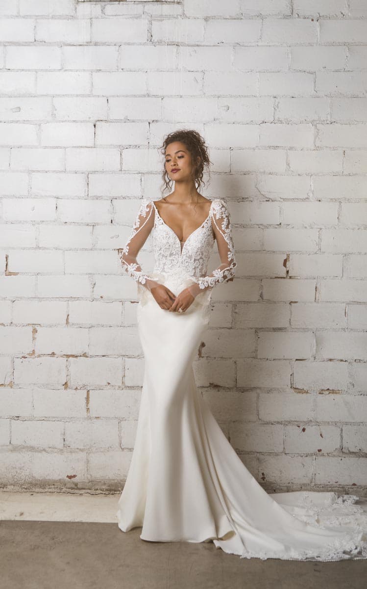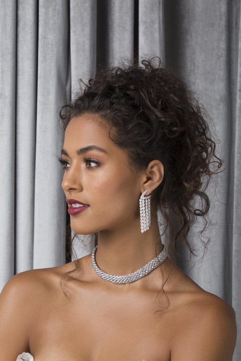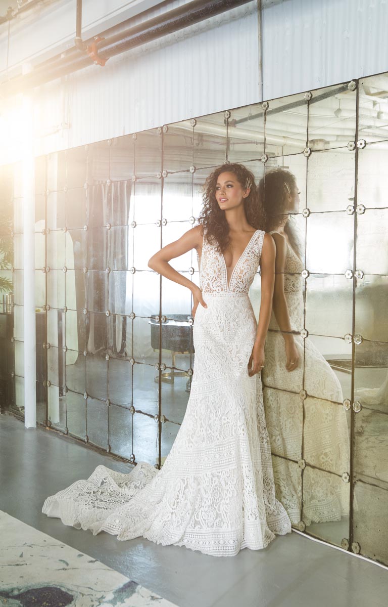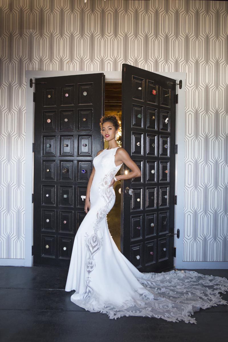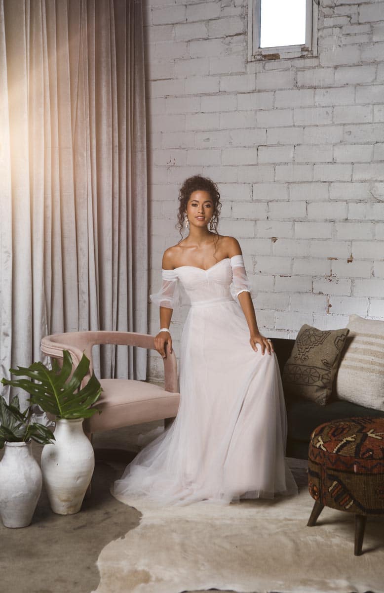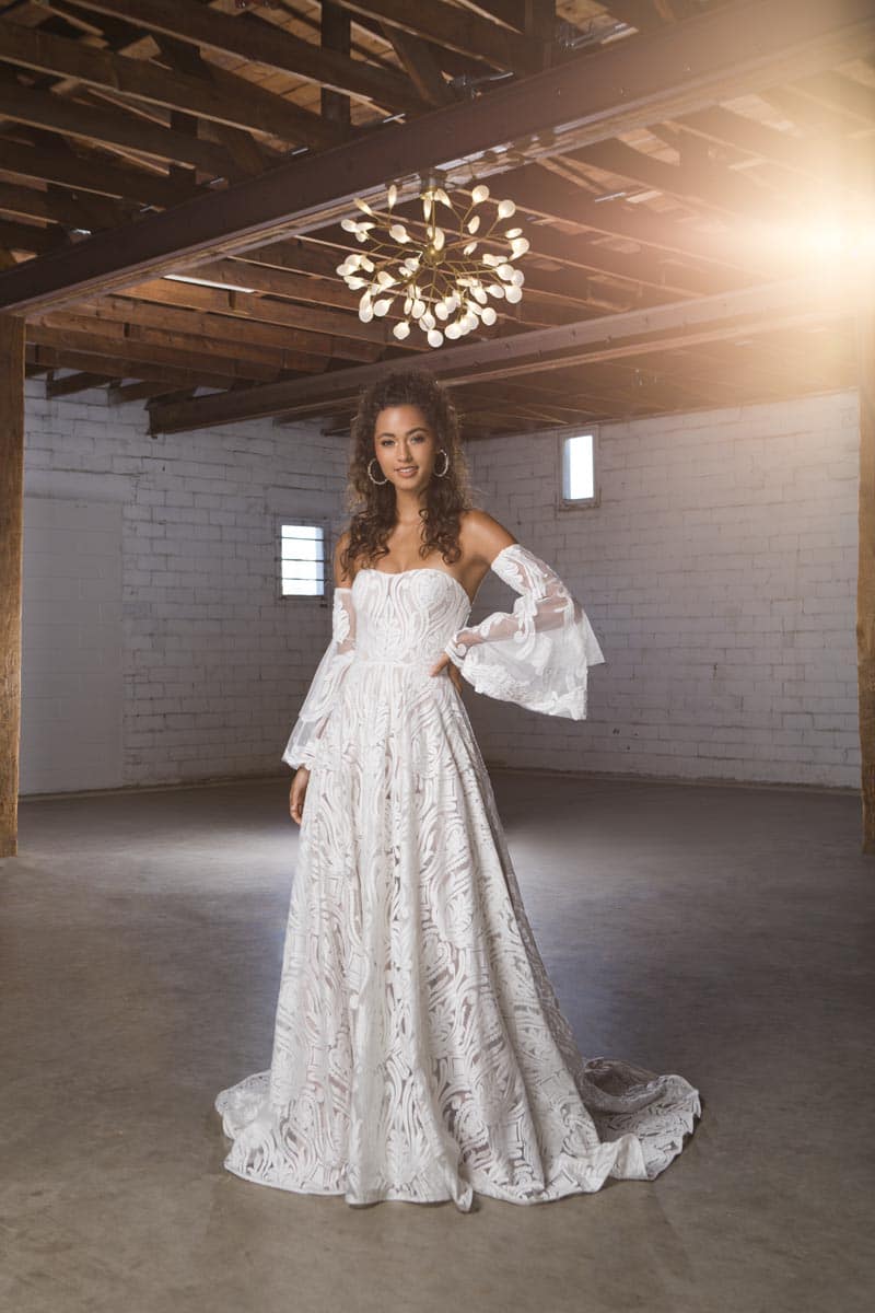 Dreamy “Sierra” by Evie Young features a sculptured bodice with airy, off-the-shoulder sleeves. Paired with Haute Bride chandelier statement earrings. Available at