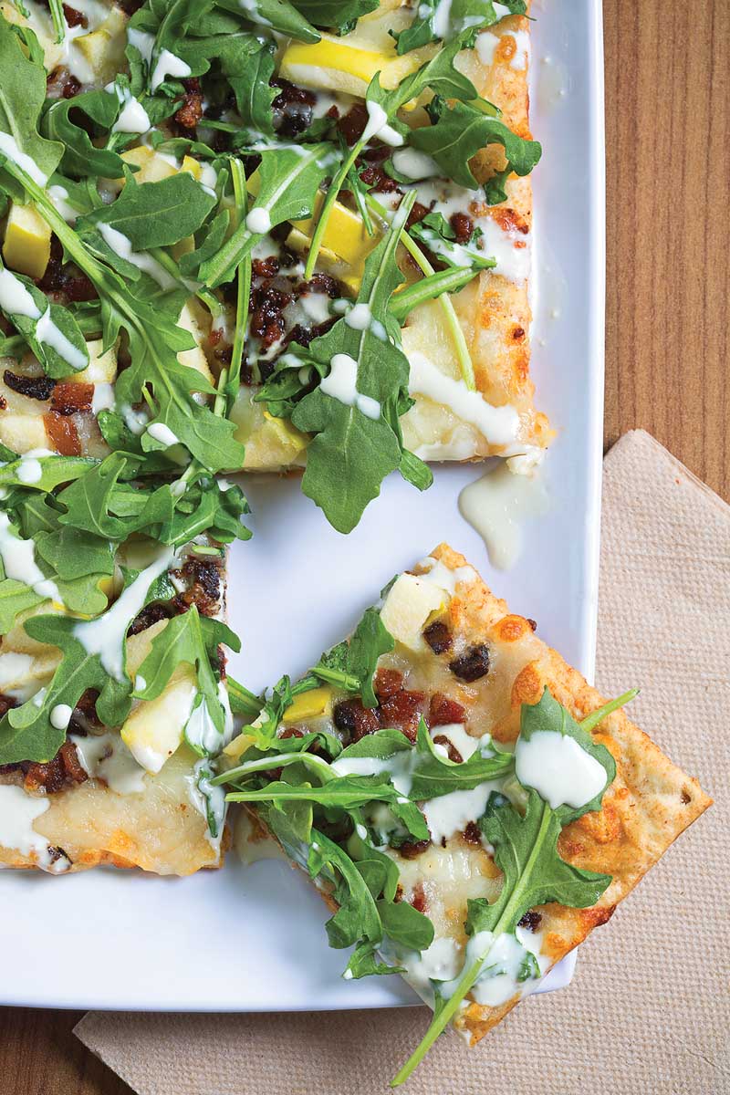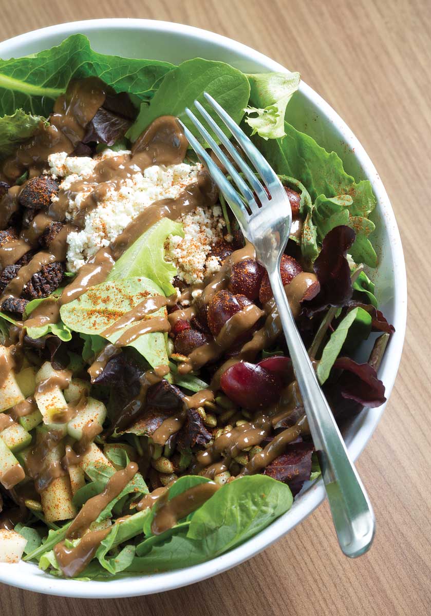 Day-to-evening offerings can fit any special diet, from gluten-free to vegan, while also offering loads of good flavor. Favorites so far are the Spicy Avocado Crunch Sandwich (with jalapenos, artisan cheeses, tortilla chips and spicy mayo on a crusty wheat bun), Bacon Blue Flatbread (with mozzarella, green apples and arugula) and Sesame Crisp Bowl (with quinoa and brown rice, edamame, spinach, cucumbers, carrots, crunchy noodles and ginger-soy vinaigrette). If you want something sweet, there’s a giant banana-chocolate chip cookie.