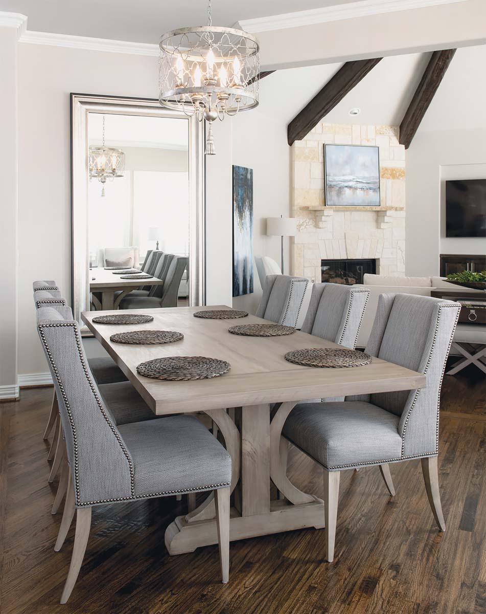 For the open space between the new kitchen and an octagonal family room, Gee commissioned a pine dining room table from Keller’s L.D. Jordan Furniture and Home, finished in the company’s custom Salvaged Gray stain and sealed with flat polyurethane. Six upholstered gray dining chairs give everyone a place at the table.