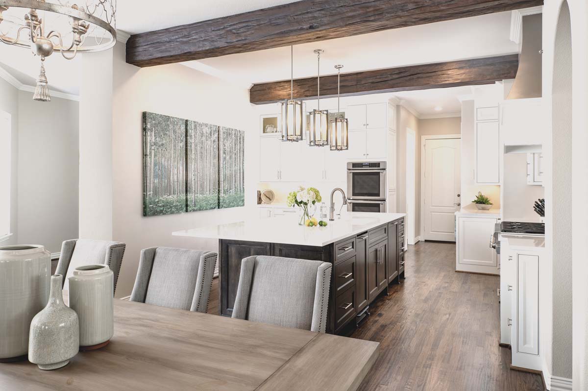 When Kathy Rivas asked interior designer Christine Gee of G-Interiors to renovate her Timarron house, built in 2002, the homeowner already knew that she wanted to address the small, closed-in kitchen; a little-used formal dining room; and the den, with its dark wood plantation shutters. “We stood in the kitchen, and I spread out my arms and said I wanted to get rid of the arches and everything, and make it all one big room — light, bright, minimalistic and more feminine.”