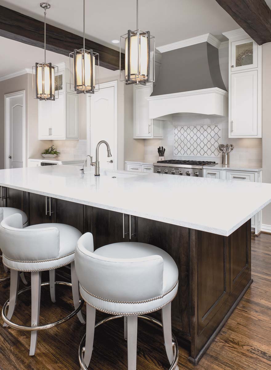 Removing interior walls allowed the designer to borrow from the old dining room space to expand the kitchen. The countertops are white quartz; the cabinetry is all custom. A trio of pendants add a modern touch, echoed by the streamlined hardware. Gee designed a metal-wrapped wood vent hood for a warm, custom look. Glass-door upper cabinets in the kitchen show off the homeowner’s pewter collection.