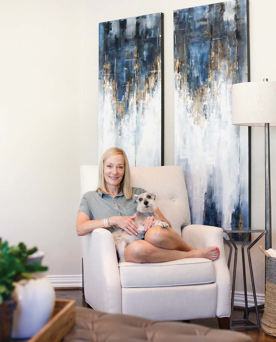 What she didn’t know was how to make that happen — Rivas says she doesn’t have the eye or inclination for design — so she put her trust completely in Gee. The project result is a calming palette of whites, blues and grays for the widowed homeowner and empty nester, who was ready to make a fresh start for herself and her miniature schnauzer, Bailey. Rivas considered looking for a smaller, updated property, but the pull of the family home where she and her husband raised their three children was strong; in addition to the good memories, the house has an idyllic golf-course location.