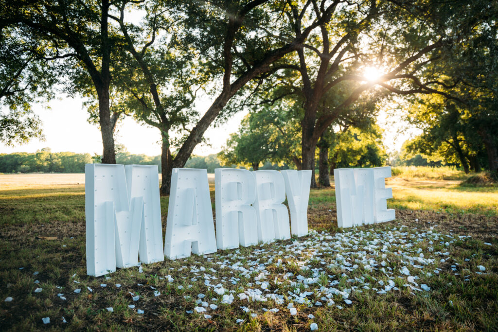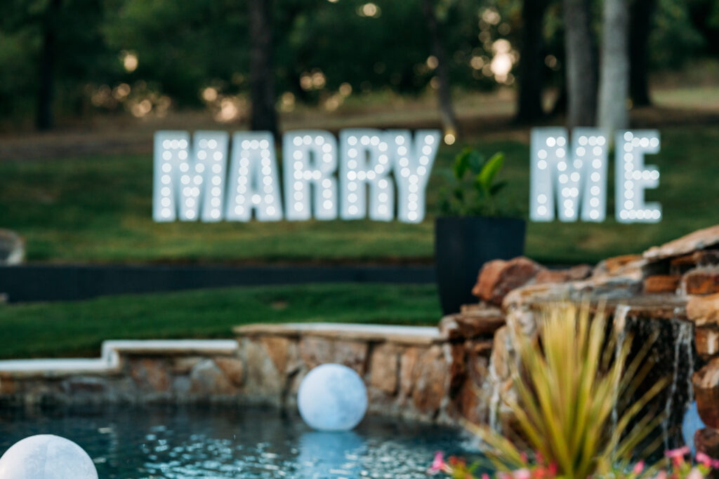 After finding the perfect ring, I knew it was time to plan the perfect engagement party. With the help of many family and friends we were able to pull off the surprise. It was a scorching hot summer day in July. Avery thinks we are going to my parents best friend’s surprise anniversary party. We both get ready and get in the car to head to what she thinks is an anniversary party. About halfway through the drive I get a call from my sister saying we need to stop at my parents house on the way to “grab some supplies for the anniversary party”. A few minutes later we pull up to my parents’ house to find big white marquee letters that say “Marry Me”. I pulled off the surprise of a lifetime. Avery changed in to a white dress that was waiting for her in the guest house before we went in to the engagement party to join over 100 of our closest family and friends in celebrating our surprise engagement! It was a night to remember.