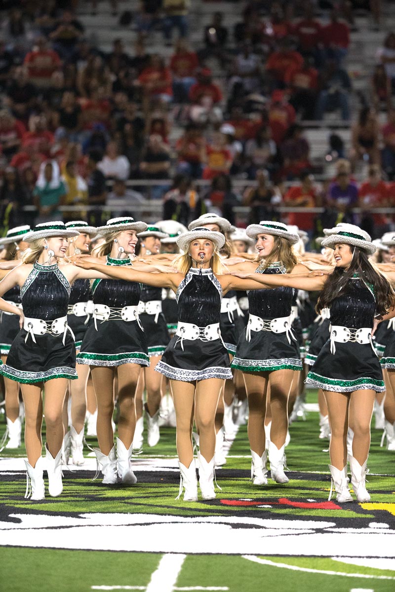 Cheerleaders will be required to wear masks and maintain social distancing. That means there will be no stunt sequences. They’ll also have to bring their own water and leave the usual community ice chest in the offseason closet. The Belles drill team will perform, too, while adhering to COVID guidelines. And there will only be a pep band at games. The full marching band is taking the season off.