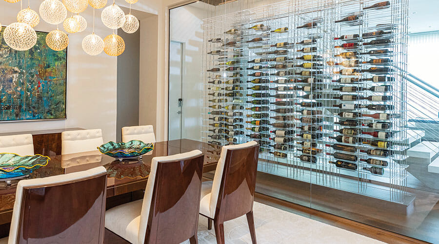For the oenophile, treating dinner party guests to a thoughtful menu of wine pairings can be central to a gathering’s success. In a Westlake home with sightlines focused on a glass-enclosed wine room — adjacent to a formal dining table and steps from the open living/kitchen area — bottles that appear to float ceiling-to-floor enhance the magic.
