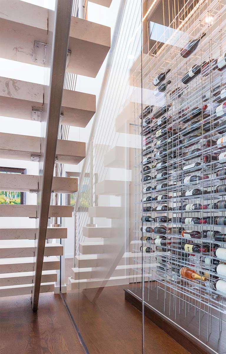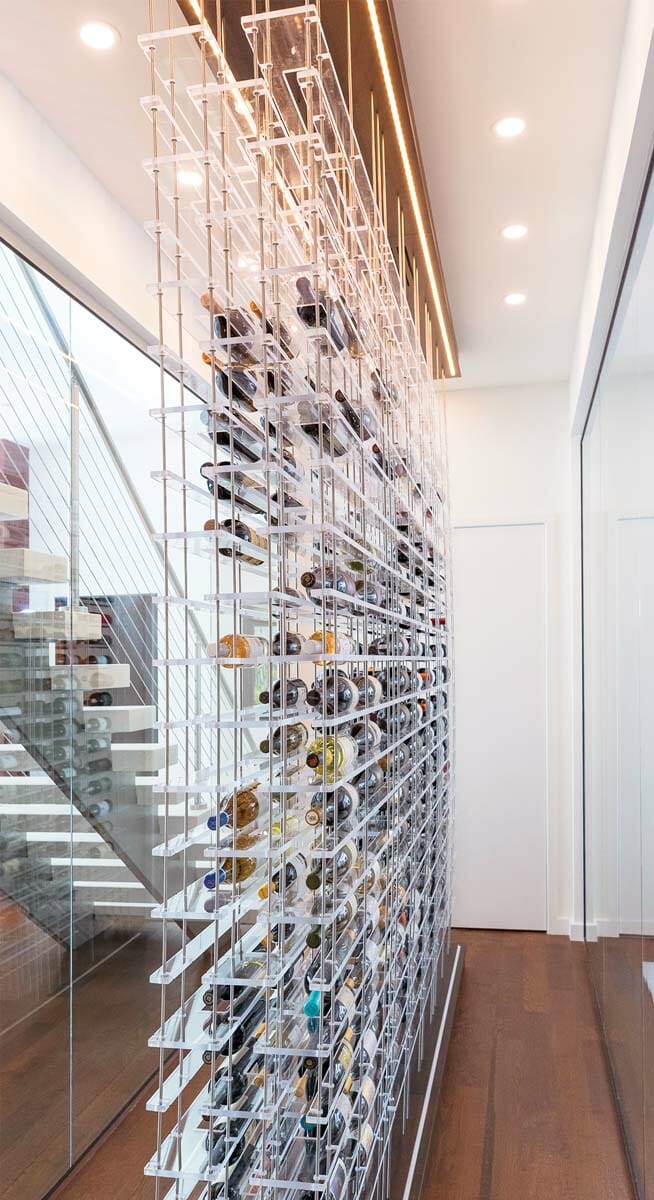 To say the wine is a focal point in the Westlake project is an understatement. It showcases the bottles in full view, organized in a system as beguiling as the artworks that surround it. It sits next to a floating staircase in a sort of symbiotic relationship where the design properties of each feature — steps and bottles both suspended by steel — enhance the other.