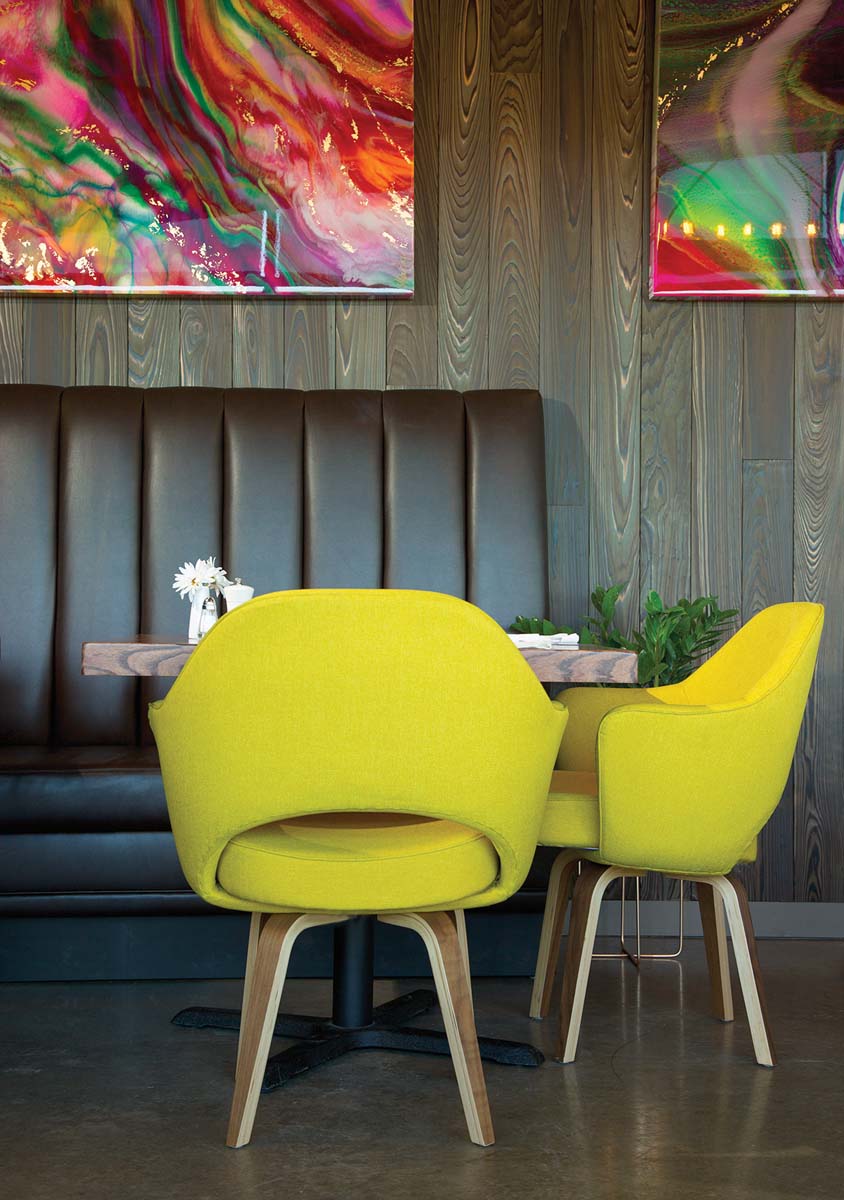It’s a lot easier to snag a table at the always-busy restaurant at the Clearfork Trailhead on the Trinity River now that Press Cafe Upstairs is open. Owner Felipe Armenta Jr. essentially doubled the seating space with the upper dining room, converted from a former meeting space. And while we love the earthy patio (especially those succulent planters) and downstairs dining room at Press, we really like the sophisticated, but comfortable vibe of the new space. Opposite the huge windows overlooking the riverside green space is a long wall covered in the artfully charred Japanese wood panels called shou-sugi-ban, crafted by Delta Millworks in Austin. The panels serve as a backdrop for three huge, colorful artworks in resin and acrylic by North Texas artist and fashion designer Alana Kay. The works brighten the room with a force equal to the citron-hued upholstered chairs at tables throughout the space. Ralph Lauren light fixtures hang from the ceiling, bathing the space in a warm glow during the evening. The upstairs dining venue, open whenever the restaurant is serving, is attached to the rooftop patio, which remains one of the primo places in town to enjoy drinks and food in nice weather. Also new, Press Cafe now accepts reservations through its website and Facebook page. Open for breakfast, lunch and dinner daily and weekend brunch at 4801 Edwards Ranch Road, Suite 105, Fort Worth,