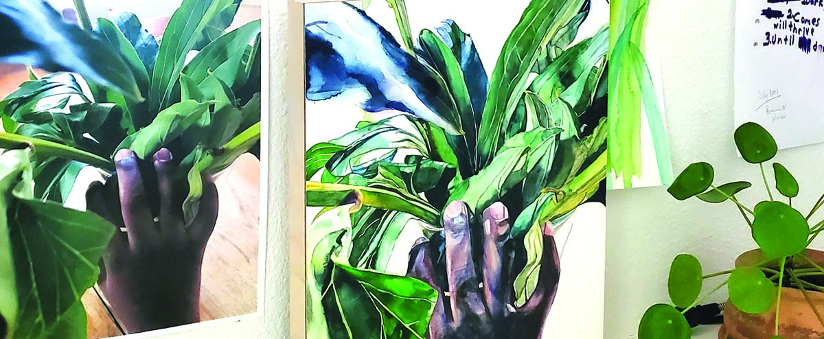 One of her most recent works is on display in the library at Hotel Dryce, the new boutique property in the 107 on Byers Avenue. The 48-by-48 watercolor called a rainbow to me depicts a Black boy peering into a lush garden. She produced the work after winning a $4,000 “You Are Here” grant presented to artists of color from Art Tooth, a local nonprofit aimed at elevating emerging artists.
