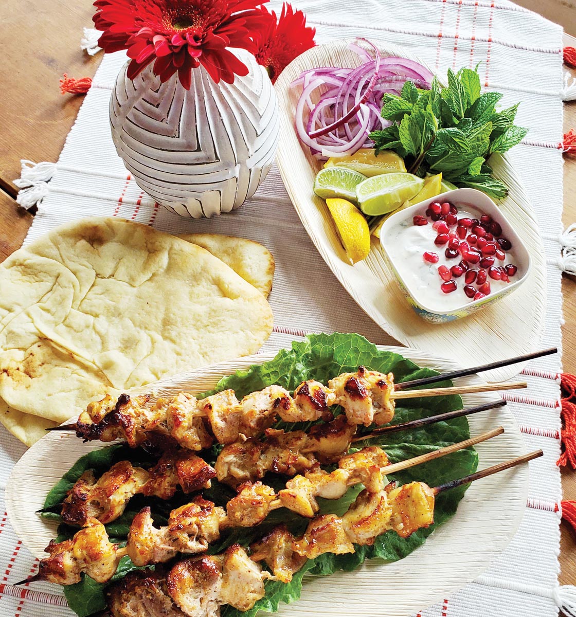 To serve the chicken tikka, Dayal likes a refreshing, colorful raita — a cool yogurt sauce laced with the clean nip of fresh mint and tart crunch of pomegranate seeds.