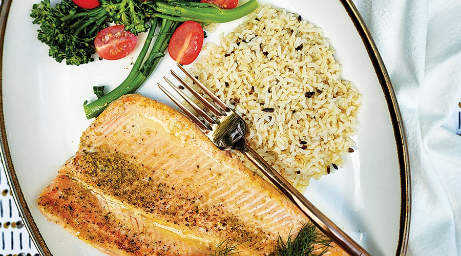 “We first had steelhead trout as a restaurant special in Colorado,” says Ladye Ann. “Then it started showing up at local fish counters; ruby red trout is also good. This recipe cooks the fish without drying it out, and the citrus gets a little syrupy for a light sauce. I have tried to add white wine, lemon juice or butter, but it’s really best with just the two basic ingredients plus spices. That makes it the perfect weeknight supper.”
