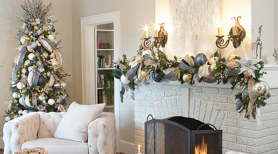 n the living room, the Christmas tree is dressed in a contemporary palette of silver, gold and dark blue, as are the swags of faux greenery along the mantel and stairway banister. The tree stands out even more against the soothing monochromatic color scheme of soft grays and white. Mistletoe hangs from arched doorways; swags of rosemary add a bit of greenery to the white-and-silver place settings in the dining room. Miniature lights twinkle, and the rooms’ soft glow is enhanced by antique sconces and chandeliers.