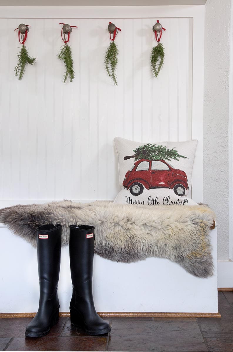The remodel also included changing out the well-used butcher-block counters in the already updated kitchen for solid-surface quartz, but keeping the handcrafted Shaws farmhouse sink. “They’d be happy to know that we did keep the blue-and-white mosaic tile backsplash behind the stove,” says Judy. “It’s part of the home’s history that we wanted to preserve.” For the holidays, Judy brings out a festive nutcracker and cookie jar.