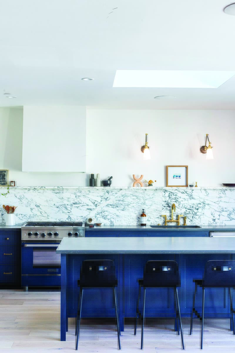 The open kitchen/dining space is meant for entertaining. The skylight above the island adds to the wash of light provided by a wall of north-facing windows. A marble backsplash with a built-in ledge is a nice contrast to the dark solid-surface countertops. The Big Chill range matches the painted millwork (Benjamin Moore Raccoon Fur). Not visible is a large walk-in pantry and storage area to the left.