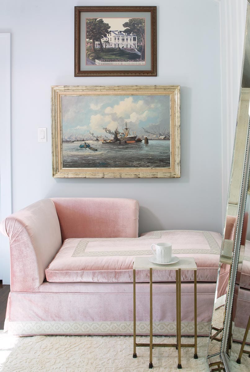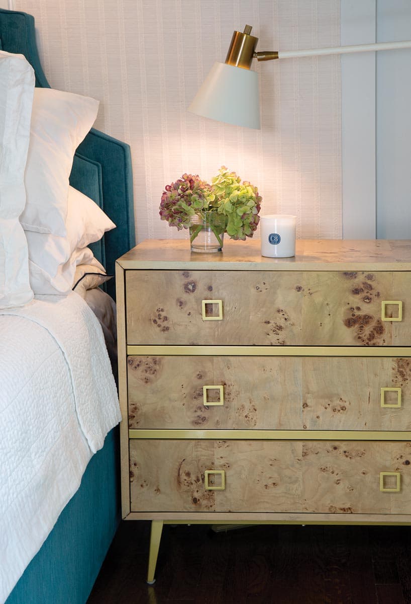 But the makeover truly shines in the couple’s personal quarters. In the bedroom, a newly vaulted ceiling covered in a subtly striped Schumacher wallpaper opens up the space. Benjamin Moore Silver Cloud — a soft blue — picks up the neutral tones of the wallpaper. Unexpected touches include the use of two vintage metal domes as oversize pendant lights and a custom velvet Sophia bed from My Chic Nest in a bold jewel tone. Double-armed sconces from Rejuvenation swing out over Katia chests from Safavieh.