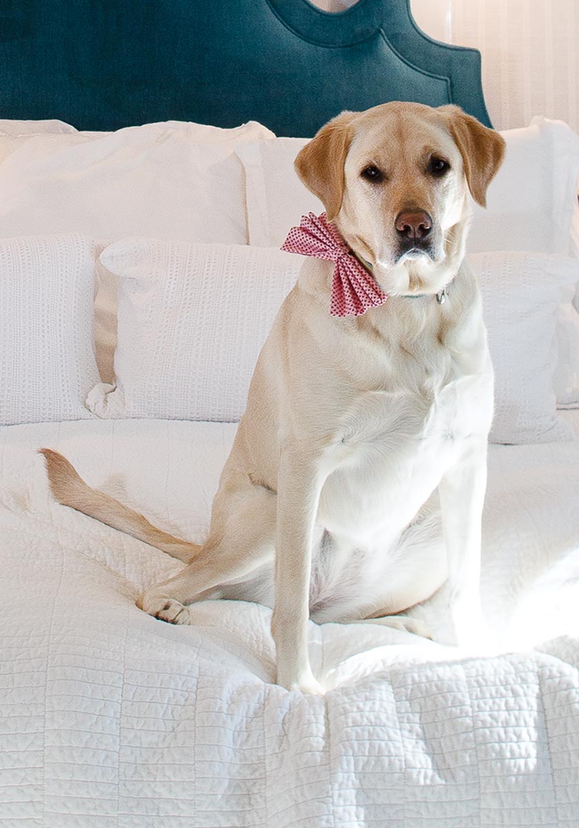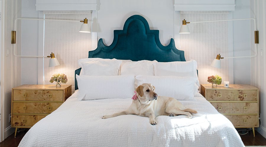 Designer Grace Mitchell knew that Sunny Mae holds a special place in the heart of owners Katy and Joe Abraham. The couple lost a pair of 14-year-old pets, a yellow Lab and a Lab mix, a few years ago. They adopted Sunny from Texas Sporting Breed Rescue, and she has the run of the bedroom and the rest of the house.