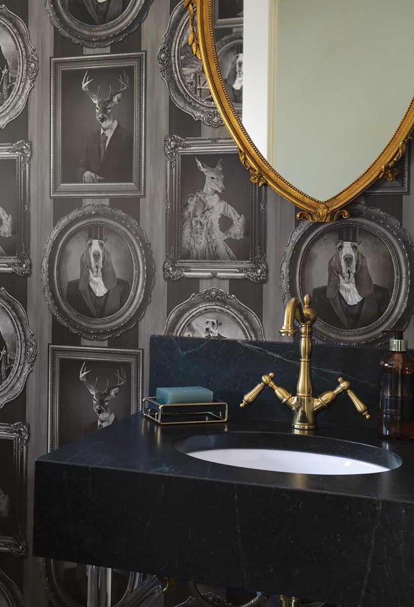An unused side porch became a powder room with whimsical wallpaper featuring dogs and deer in Victorian-era dress, eye-catching dark gray ceramic floor tile and a black granite sink with brass and acrylic accents. Mitchell apparently had been saving the paper for the perfect clients.