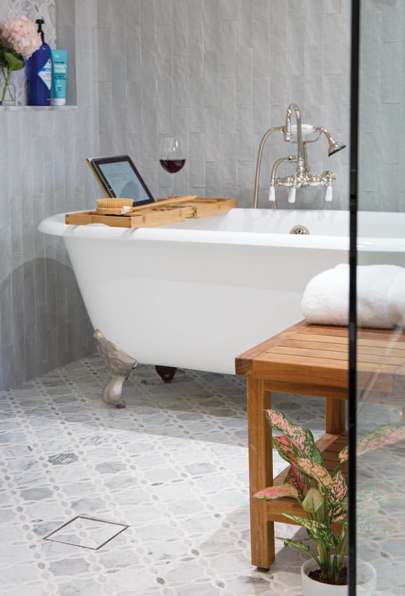 “Sharing a tiny bathroom with Joe was especially a challenge,” says Katy. “I like my products, and they take up a lot of room, which isn’t good when you have one sink and not a lot of counter space.” Their bathroom also was the only one on the first floor. “I had a couple of contractors give us bids, but they all wanted to expand the footprint of the house.”