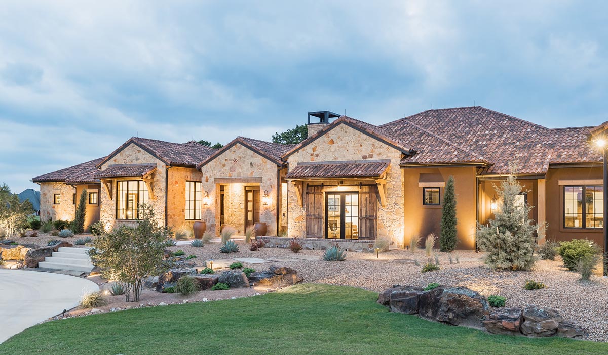 New landscaping by Top Cut Lawn and Landscape Services surrounds the house and pond, and includes drought-resistant plants — feather grass, cactus, lantana, yucca, agave, salvia — along with beds of decomposed granite, gravel, river rock and massive landscape boulders. The earthy palette complements the home’s stone exterior and the clay tile roof. Strategically placed landscape lighting ensures a subtle glow when the sun goes down.