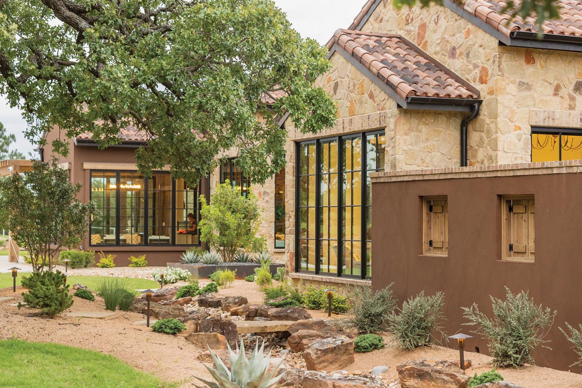 The Dumlers loved the site but not the house. “It was too big,” says Patty. “We wanted a single-story home and something less traditional.” While the retired couple worked on ideas for a new house on the site, they had to do a bit of remodeling to the old one to make it livable. They partnered with builder Frank Ritz of Colleyville-based Ritz Ventures to work up house plans. “We finally were at the point where it was drawn up, and we were ready to break ground when I happened to be looking at a magazine and saw the home that left me thunderstruck,” says Patty.